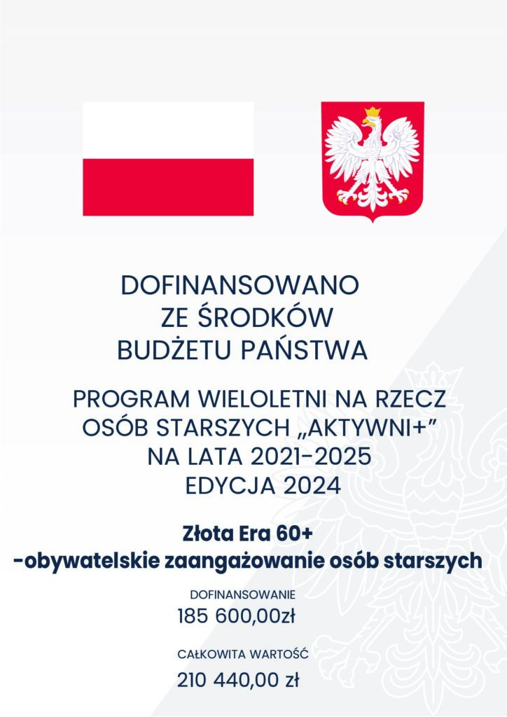 Zadanie publiczne pn. „Złota Era 60+ – obywatelskie zaangażowanie osób starszych” jest współfinansowane w ramach rządowego programu wieloletniego na rzecz Osób Starszych „Aktywni+” na lata 2021-2025. Edycja 2024.